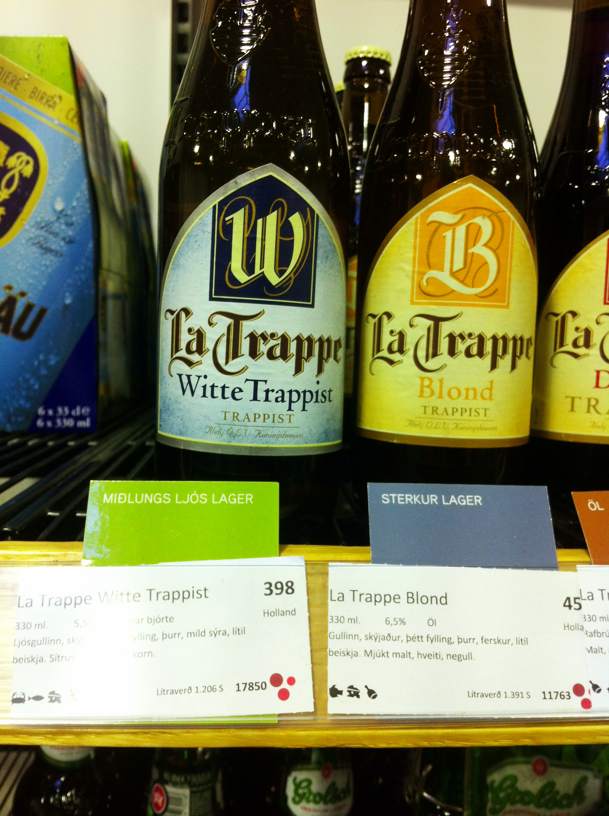 Við Íslendingar erum skammt á veg komnir í bjórmenningu, það er ekki nein ný vitneskja svo sem. Við erum langt á eftir vel flestum öðrum þjóðum heims í þessum efnum. Skýringin sennilegast sú að við máttum ekki drekka bjór þar til nýlega en fáfræði kemur einnig við sögu. Við erum ekki nægilega bjórmenntuð þjóð. Við erum þó öll að koma til, úrval bjórs fer sífellt batnandi, bjórvitund barþjóna er hægt og rólega að komast á viðunandi form og lítil spennandi brugghús að skjóta upp kollinum. Fólk er orðið forvitið og byrjað að fikta í mismunandi bjór. Þetta er jákvæð þróun því þetta þýðir betra úrval í framtíðinni. En það má alltaf gera betur, við verðum að halda áfram á þessari braut. Það er mikilvægt að fólk sem er forvitið um þessa hluti eigi sem auðveldast með að fá aðstoð og upplýsingar því það er þannig sem bjórvitundin vex og dafnar. Það er því ógurlega pirrandi þegar maður verður vitni af beinlínis rangri miðlun upplýsinga af hendi fólks sem hefur með sölu á bjórs að gera. Þetta sé ég stundum á pöbbum borgarinnar þegar ég spyr um ákv bjór sem á boðstólnum er. Stundum vita menn akkúrat ekkert um það sem þeir eru að servera sem er jú afar miður. Eins er þetta stundum svona í Vínbúðinni góðu. Hef oft orðið vitni af því þegar fólk er að spyrja um ákv bjór að starfsfólk gefur kolrangar upplýsingar. Stundum svo mikið bull að ég hef ekki getað setið á mér og leiðrétt miskilninginn svo lítið fari fyrir. Eitt sinn heyrði ég starfsmann segja „nei nei Freyja er ekki hveitibjór, hann er síaður“ og annan segja „ taktu frekar Leffe ljósan, sá brúni er dökkur bjór og miklu bragðmeiri og ekki eins sætur“. Ekki alveg orðrétt en mjög nálægt því. Þetta er sem betur fer ekki algilt, það er fullt af fólki í bæði Vínbúðinni sem og á pöbbunum sem veit um hvað það er að tala en það má samt laga til. Myndin hér að ofan sem tekin var í gær er dálítil áminning um að það má laga margt. Manni findist eðlilegt að upplýsingar um bjórinn væru réttar í Vínbúðinni. La Trappe Witt er ekki miðlungs ljós lager heldur yfirgerjaður hveitibjór sem flokkast sem öl. La Trappe blond er heldur ekki sterkur lager, langt í frá. Ég veit ekki út í hvern er að sakast, kannski upplýsingar komnar frá innflytjanda? Kannski er einhverstaðar skrifað að notað sé lagerger í bjórinn þó ég efist um það, bruggaðferðin sem og bragð segja allt annað.