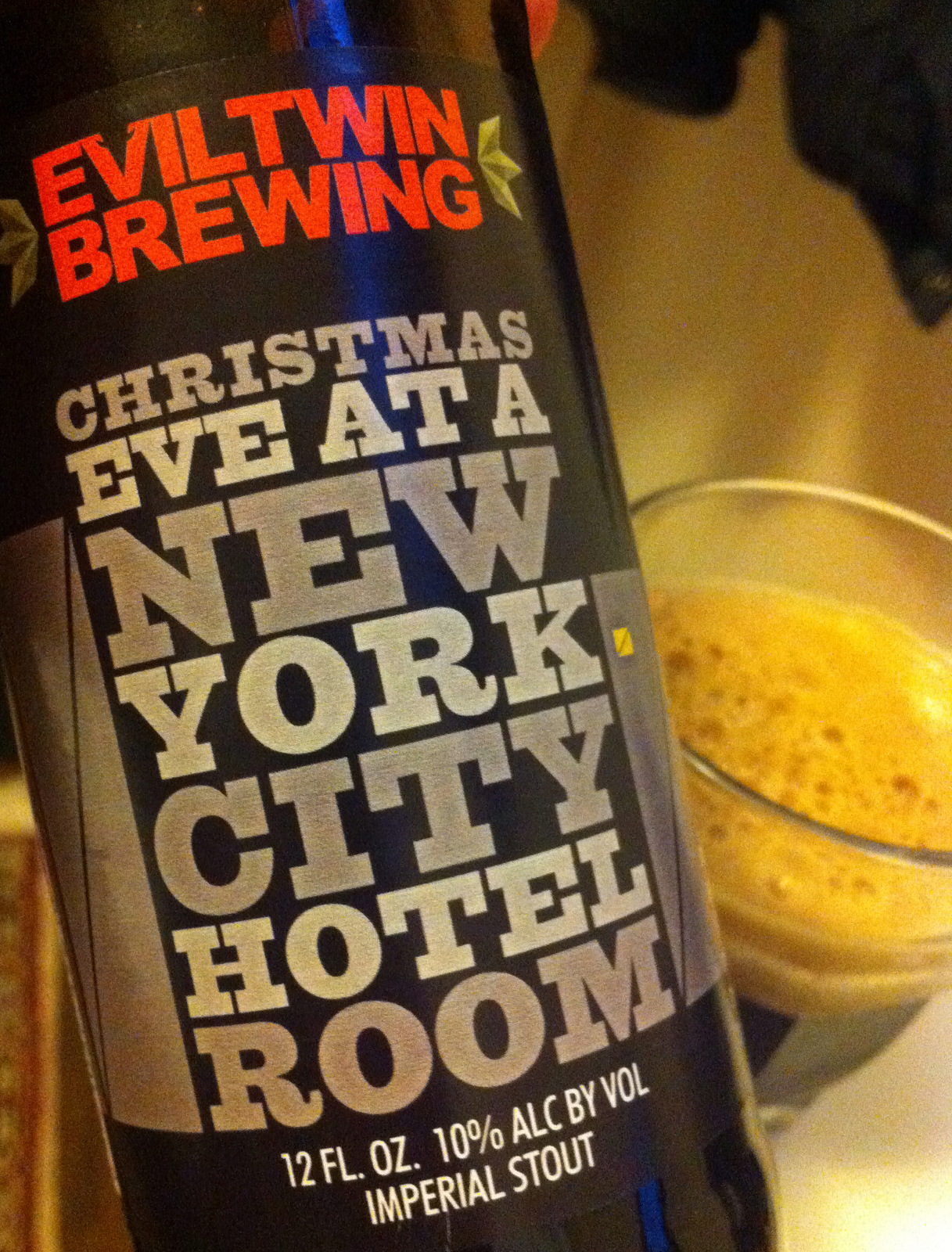 Hér í Stokkhólmi er allt á kafi í jólum. Jólaljós út um allt, jólakaffidrykkir, jólalög í öllum hornum og fólk á fullu að versla jólagjafir og svo auðvitað jólabjórinn í Systembolaget. Ég hef haft það fyrir hefð sl 3 ár að skella mér til Stokkhólms í desember til að hlaða jólabatteríið og skoða nýja jólabjóra. Þeir hérna hjá Systembolaget eru duglegir að panta inn nýja jólabjóra ár hvert. Í ár eru það nokkrir sem hafa fangað athygli mína og m.a. þessi hér frá Evil Twin. Sá heitir því undarlega nafni Christmas Eve At a New York City Hotel Room. Þó ég sé staddur á hótelherbergi í Stokkhólmi og það er ekki alveg jólanótt þá ákvað ég að smakka, þetta er eins nálagt því og ég kemst að vera í NYC á jólanótt. Um er að ræða 10% imperial stout sem fær nokkuð góða dóma á veraldarvefnum. Ég varð hins vegar ekki upprifinn. Í nefi eru ristaðir dálítið brenndir tónar. Ögn sæta og brennt malt. Í munni er hann með meðal fyllingu, nokkuð beiskur og þurr á tungu. Afar lítil sæta en það er einmitt það sem ég vil fá í Imp stout, þ.e.a.s SÆTUNA. Ristað kaffi, einhver jörð eða hnetur og svo bara mjög klassískt svona stoutyfirbragð. Ekki snefill af jólafíling og get ég ekki með nokkru móti skilið afhverju þeir/hann hefur ákveðið að tengja þetta við jólin. Jú jú, það er svo sem viðeigandi að eiga við svona bjór á köldrum vetrarkvöldum en þessi bjór er bara alls ekkert öðruvísi en margir aðrir imp stout bjórar frá Evil Twin. Þetta er þannig séð samt hinn flottasti imperial stout og vel þess virði að smakka en alls ekki eitthvað sem maður sérpantar eða eltist við á enda veraldar.