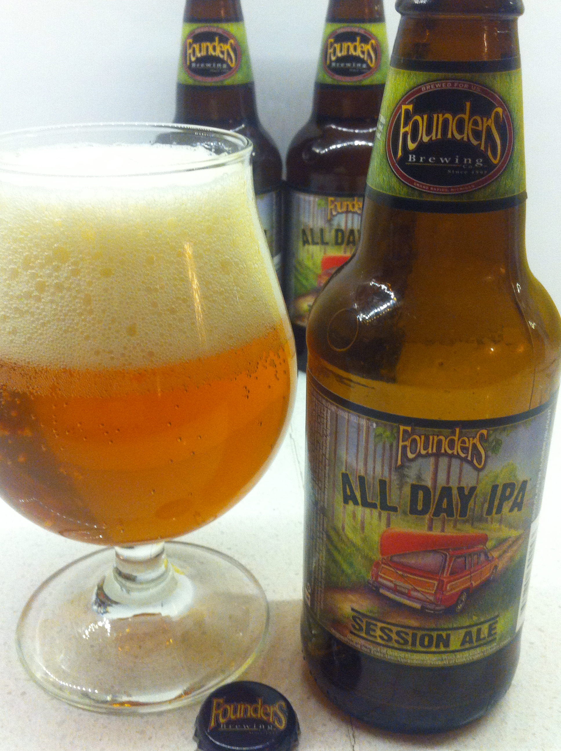 Annar sem kominn er til landsins er svo Dirty Bastard Scotch Ale sem varð á vegi mínum á Roadhaous um daginn á fáránlega flottu verði vil ég bæta við. Virkilega skemmtilegur bjór sem ég mæli sterklega með. Svo laumaði lítil bjórfluga að mér, eða kannski barfluga frekar að Founders All Day Session IPA væri á leið í ÁTVR. Þetta er algjörlega frábær IPA og stendur fullkomlega undir nafni. Þetta er svona bjór sem maður getur drukkið allan daginn nonstop. Reyndar kom það mér á óvart hve fljótt hann kláraðist úr glasi, stórhættulegur alveg en það er svo sem það sem session bjór á að gera, þ.e.a.s vera auðdrekkanlegur bjór við öll tækifæri. All Day er fallegur í glasi, tær og flottur með fallega froðu. Í nefi dansa amerískir humlar líkast til Cascade og Amarillo eða eitthvað í þeim dúr, ekkert annað rugl. Í munni er meðal fylling og notalegt gos. Humlar eru mjög hreinir og þægilegir og eftirbragð gott og langt. Virkilega „clean“ IPA, ekkert rugl sem truflar. Nokkurn veginn svona held ég að amerískur IPA eigi að vera og held ég að allir sem kunna vel við stílinn eigi eftir að elska þennan, líka þeir sem alls ekki fíla IPA heheh. Já virkilega notalegur IPA og ef úr verður að hann fáist í ÁTVR þá mun þessi ávalt fljóta með í innkaupaferðum mínum í framtíðinni.