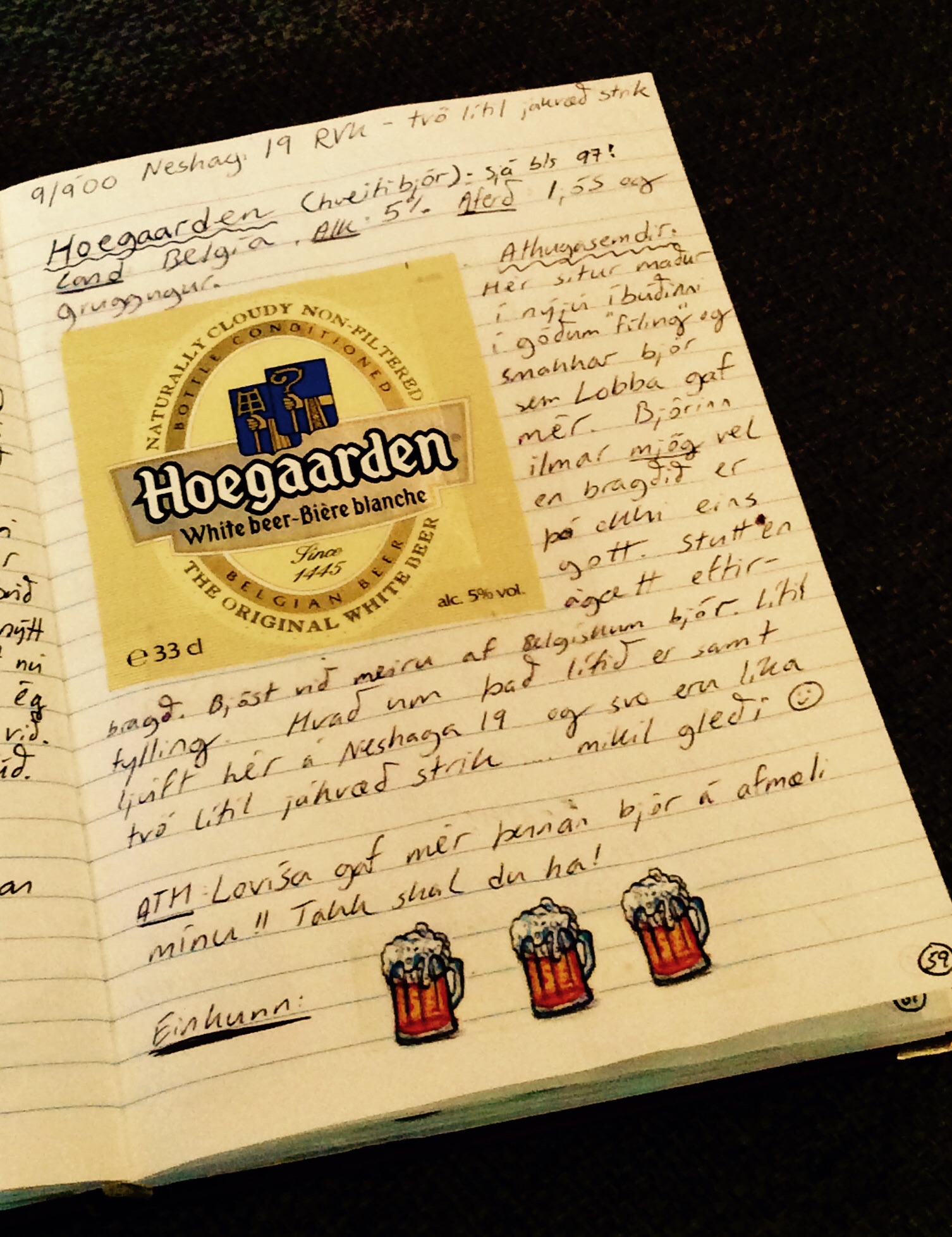 Já þannig er það, súrt en líklega rétt. Ég hef ákveðið að breyta þessu hérna hjá mér, ég er samt ekki alveg tilbúin í að hætta að blogga/skrifa um bjórinn því það er vissulega svo margt hægt að fjalla um annað en dóma. Ég ætla hins vegar að reyna að hætta að leggja persónulegt mat á bjórinn, hætta að dæma og fara meira í það að lýsa hvernig ég upplifi bjórinn. Ekki þá með orðum eins og góður eða vondur, meira í átt að hvaða bragð, hvernig fylling og svo frameftir götum. Reyna að vera hlutlaus ef það er hægt. Það er þó líka snúið því t.d. það sem ég upplifi sem bananabragð er fyrir öðrum pera. Upplýsingar um hráefni, bruggaðferð og brugghús er hins vegar eitthvað sem ekki er hlutlægt og ætti að vera óhætt að taka mark á. Svo er líklega rétta að miða alltaf bara við fyrsta mat, „first impression“ og vita þá að það mun líklega breytast fljótt. Ég var líklega kominn á rétta leið þegar ég byrjaði alveg í blábyrjun að skrá í glósubókina mína. Þá skrifaði ég alltaf hvort um væri að ræða fyrsta smakk, hve marga bjóra ég hafði smakkað þennan dag, hvar ég var staddur og hvernig stemningin var á þeim tíma. Þegar ég fletti upp í glósubókinni góðu má t.d. sjá hvaða bjór ég var að smakka þegar ég fékk að vita að ég ætti von á mínu fyrsta barni. Þetta var árið 2000 og bjórinn Hoegaarden (sjá mynd að ofan). Hehe, hann fékk þó ekki nema 3 krúsir þrátt fyrir mikla geðshræringu. Kannski var maður bara í sjokki?