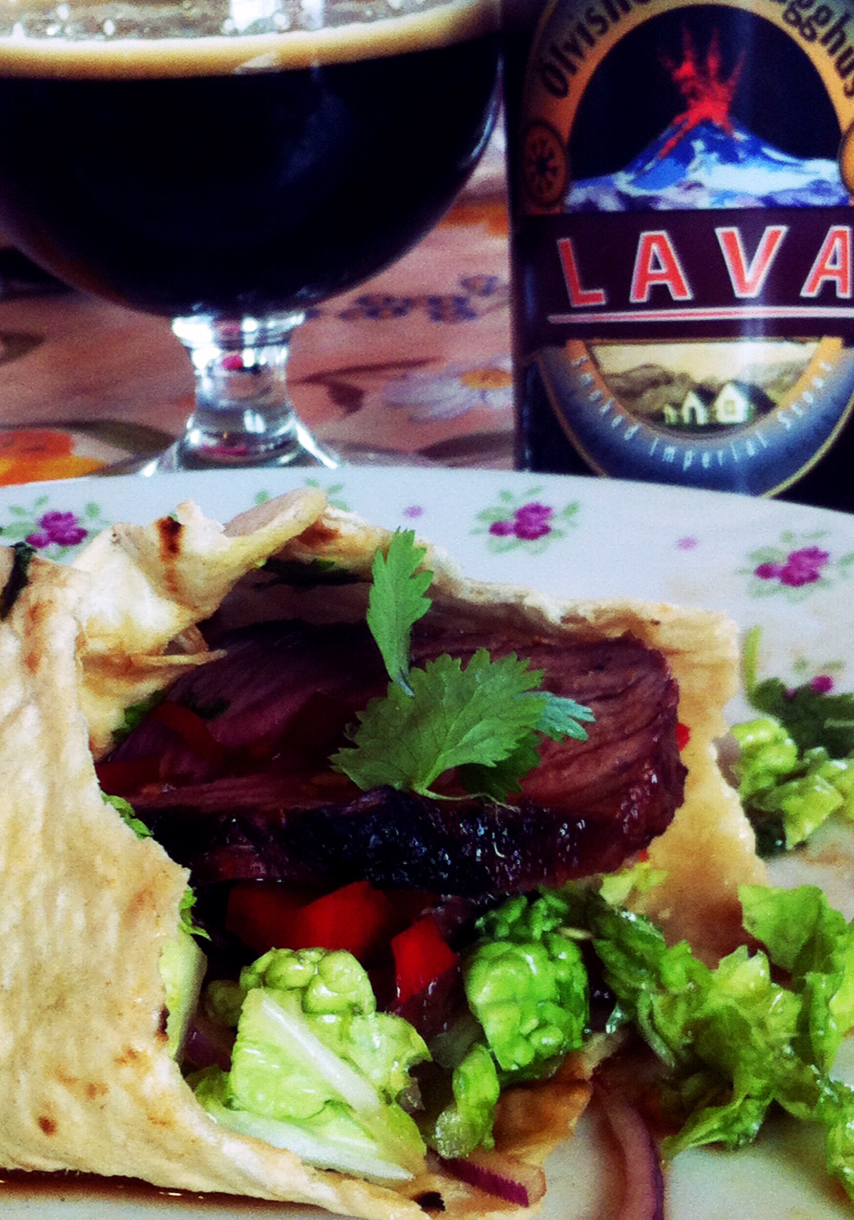 Það þarf að drekka eitthvað með þessum herligheitum, eitthvað sem ekki gerir lítið úr kjötinu og eitthvað sem gengur með hitanum frá chillípiparnum. Við erum að tala um bjór, það þarf stóran strák hérna og hvað er þá betra en hinn einstaki Lava Stout frá Ölvisholti? Hann er þróttmikill og þéttur án þess að vera ofvaxinn. Hitinn og sæti vínlegi keimurinn frá áfenginu rennur saman við chillíhitann og svo er þessi unaðslegi nánast reykti BBQ keimur í bjórnum sem auðvitað er alveg að dansa með grillbragðinu af kjötinu. Þetta getur ekki klikkað. Bjórinn bætir flottum flækjum við réttinn og rétturinn lyftir bjórnum á annað stig, frábært!