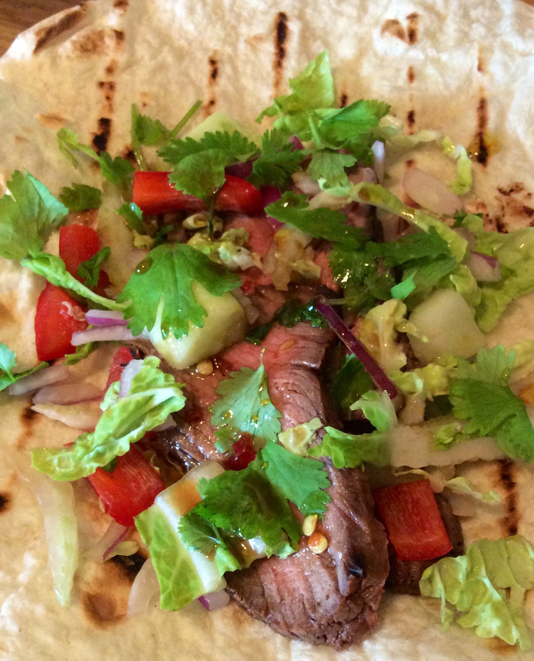Nóg um það ég átti kjötið og vantaði bara eitthvað að gera með það. Ég opnaði mér einn Punk IPA frá Brewdog en góður bjór kallar oft fram góðar hugmyndir og þarna kom það, innblásinn af sjálfum meistaranum Gordon Ramsay og svo vitleysingunum í Grillsumarið Mikla sem sýnt er á Stöð 2 um þessar mundir ákvað ég að gera ungnauta burito með fersku brakandi sallati og chillí, lime, kóríander dressingu.